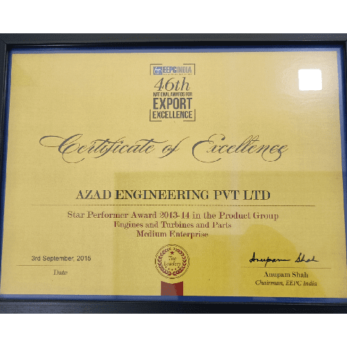 “Certificate of Excellence – Star Performer Award 2013 – 14 in the product group Engineand Turbines and Parts” award from Engineering Exports Promotion Council for 2013-14.