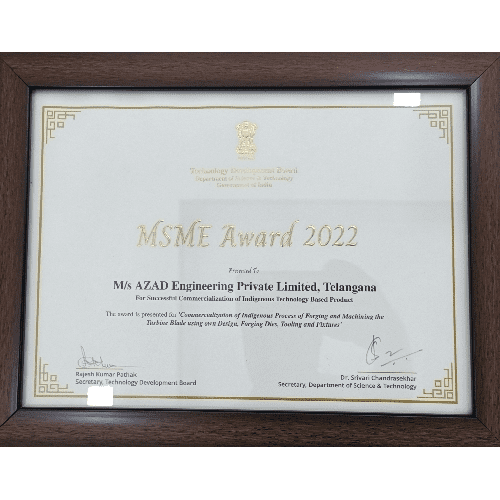 ‘National’ award from Ministry of Micro, Small & Medium Enterprises Office of the Development Commissioner (MSME) for “Commercialization of Indigenous Process of Forging and Machining the Turbine Blade”.